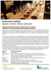 Zudem geben wir einen sensorischen Überblick über die Weinwelt und setzen diese in Bezug zu unserer Herkunft der Schweiz und zum Kanton Schaffhausen. Dazu degustieren wir 8 Weine aus dem Kanton Schaffhausen im Vergleich zu den europäischen Provenienzen.