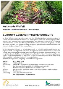 An dieser Infoveranstaltung erörtern wir, wie eine kleinräumige Lebensmittelversorgung in Zukunft aussehen könnte. Wir nähern uns der Frage an, wie es um die Versorgungssicherheit steht. Wir brauchen dazu sicher intakte Böden, eine resiliente Landwirtschaft und kleine Familienbetriebe. Gerade der UNO-Agrarbericht hat unmissverständlich dargelegt, dass die regionalen Familien- und Kleinbetriebe die Versorgung gewährleisten. Und dabei spielen die Frauen in der Landwirtschaft eine grosse Rolle.